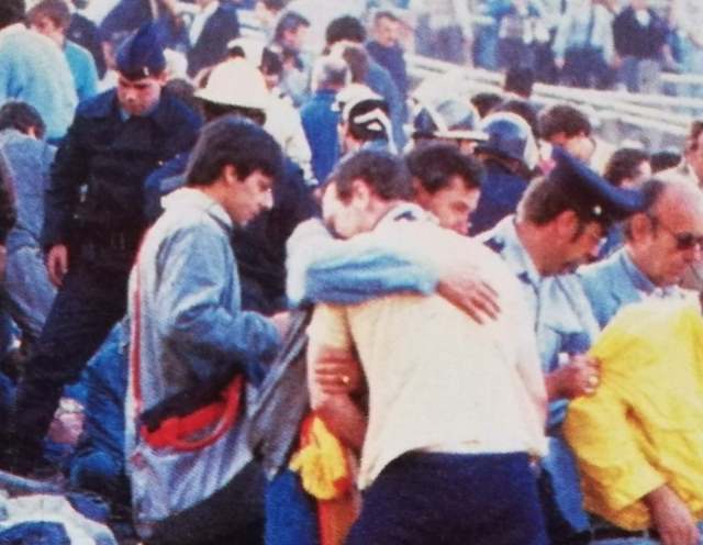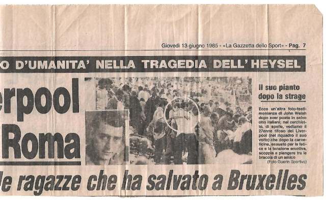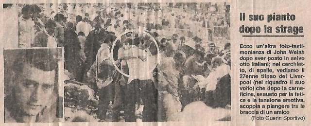 Un abbraccio fra due persone sugli spalti di una curva, la gente che defluisce e a terra il caos! Poteva essere un'immagine come tante, realizzata il giorno della finale di Coppa Campioni fra Juventus e Liverpool allo Stadio Heysel di Bruxelles, teatro del massacro più grave nella storia del calcio giocato a livello internazionale e di cui oggi ricorre il 38° anniversario dal 29 maggio 1985. In realtà i protagonisti di quel gesto, nei giorni seguenti ai tragici fatti, divennero conosciuti da tutti. Al momento dello scatto il madonese Severino Traina (a sinistra) senza saperlo si era stretto a Jonh Welsh (di spalle con i pantaloni blu scuro e la maglietta color crema), il quale piangendo gli si era letteralmente gettato addosso: Il nostro concittadino era appena stato a contatto con un eroe! Dopo quell'immagine, i due abbandonarono la zona e si misero in sicurezza invadendo insieme il campo da gioco. Fra i parecchi articoli della stampa nazionale ed internazionale apparsi successivamente sui vari giornali, infatti, venne alla luce la verità. John Welsh, tifoso dei Reds presente quel giorno nel settore Z dello stadio, aveva salvato parecchie persone dalla calca! Severino che casualmente si era riconosciuto nella fotografia dalla sua giacca di pelle, una volta lette le notizie rimase stupito: "Come un inglese? Portava con se sia una sciarpa del Liverpool che della Juventus!". Poi aggiunse: "Quel ragazzo con il gesto che ha compiuto ha dimostrato che anche fra di loro non tutti sono violenti!". Fondamentale per recuperare e ricostruire i dettagli di una storia così importante, fu un articolo di Remo Traina, apparso su "L'Eco di Bergamo" il 14 giugno 1985, il quale prendeva spunto da un altro della Gazzetta dello Sport, scritto il 13 con la foto dei due protagonisti (pubblicata qualche giorno prima sul settimanale Guerin Sportivo) e la celebrazione dell'inglese: "È nostro concittadino, per la precisione si tratta di Severino Traina di Madone, il giovane che, come appare in una fotografia pubblicata su un quotidiano sportivo, abbraccia il tifoso del Liverpool, John Welsh, che quel tragico 29 maggio allo stadio Heysel di Bruxelles, rischiando la propria vita, salvò almeno una ventina di persone da quella incredibile carneficina. Severino Traina si è riconosciuto per caso guardando la fotografia e gli sono venuti in mente quei terribili momenti. “si, c’ero anch’io – ci ha detto – ma non avrei mai voluto esserci. In quella bolgia, in quell’inferno, ho visto quell’inglese darsi da fare per soccorrere quante più persone poteva e quando la polizia belga lo mandava via e non lo lasciava portare aiuto, si appoggiava a me che ero lì vicino e piangeva, piangeva disperatamente. [...] “Non so se a causa di questa terribile esperienza – ha concluso il sig. Traina – tornerò ancora in uno stadio, forse si perché amo lo sport in generale e il calcio in particolare. Martedì prossimo sarò anch’io a Torino, assisterò anch’io all’incontro tra John e gli altri italiani, per salutare un’altra persona che come me ama lo sport e disprezza la violenza". L'eroe in Belgio fu invitato in Italia per incontrare e ricevere il ringraziamento dai nostri connazionali salvati. Severino purtroppo ci ripensò e a dispetto di quanto dichiarato nell'articolo, probabilmente ancora scioccato dagli eventi, non si recò nel capoluogo piemontese per salutare John e non lo rivide più. Il trafiletto fu di grande aiuto anche per sviluppare il documentario "I madonesi nella strage dell'Heysel" che abbiamo pubblicato sulla nostra piattaforma esattamente un anno fa. All'interno del filmato avevamo inserito una scansione della foto in questione presa dalla Gazzetta, in bianco e nero e molto sgranata, perché non avevamo a disposizione l'originale. Con il tempo, però, abbiamo recuperato anche una copia del Guerin Sportivo n° 23 del 1985, dove all'interno della sezione fotografica situata a metà della rivista (a pag. XIII) si trova l'immagine a colori del famoso abbraccio che abbiamo riproposto in questo articolo. Un altro piccolo successo delle nostre ricerche che dalla data di creazione del cortometraggio non si sono mai fermate. E' stato possibile divulgare quella foto poiché i diritti d'autore risultano scaduti, ai sensi dell'Art. 92 della legge n°633 del 22 aprile 1941.
