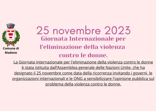 La Giornata internazionale per l'eliminazione della violenza contro le donne è stata istituita dall'Assemblea generale delle Nazioni Unite, che ha designato il 25 novembre come data della ricorrenza invitando i governi, le organizzazioni internazionali e le ONG a sensibilizzare l'opinione pubblica sul problema della violenza contro le donne.
