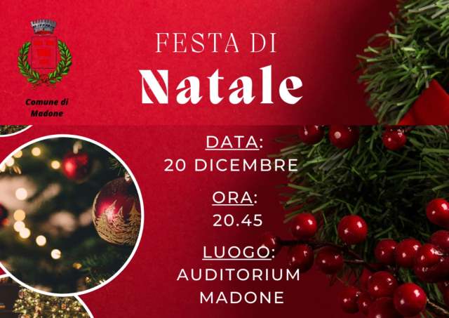 L'amministrazione comunale è lieta di invitare tutti i cittadini alla 14esima edizione della Festa di Natale che si svolgerà mercoledì 20 dicembre alle 20:45 in Auditorium, dove accompagnati dal Maestro Diego Cavaletti della scuola "Vivi in musica" e dai suoi migliori allievi, verranno premiati gli studenti e persone meritevoli per aver sostenuto gratuitamente a vario titolo i bisogni del nostro paese. A seguire ci sarà un rinfresco. VI ASPETTIAMO NUMEROSI!!!!
