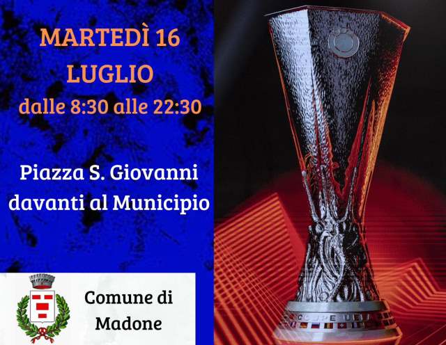 Siamo felici di informare che la riproduzione della Coppa dell'Europa League vinta dall'Atalanta farà tappa nel nostro paese. Il trofeo verrà esposto al pubblico, davanti al municipio, nella giornata di Martedì 16 Luglio, dalle ore 8:30 alle ore 22:30.
