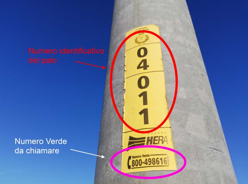 - Contattare il Numero Verde 800.498.616 della società che gestisce il servizio, ovvero HERA LUCE, e segnalare il numero identificativo del palo spento (dati presenti sullo stesso, etichetta gialla e scritta nera - osservare la foto in basso).