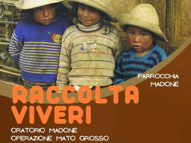 I ragazzi del CRE, in collaborazione con i giovani dell'OPERAZIONE MATO GROSSO (OMG), vi invitano a compiere un GESTO di CARITA' verso i più poveri dell'America Latina (Perù, Bolivia, Ecuador, Brasile). Raccogliamo Pasta, Riso, Zucchero, Farina, Scatolame, Olio in lattina e alimenti per bambini. La raccolta dei viveri nelle scatole avverrà MARTEDI' 27 GIUGNO DALLE ORE 09:15 ALLE ORE 16:00.