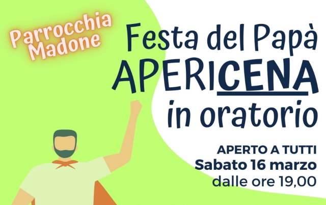 Sabato 16 marzo 2024, alle ore 19:00 in Oratorio, Apericena per la festa del Papà, con la possibilità di scegliere fra diversi Taglieri. Durante la serata, animazione e giochi (Attenzione! La TOMBOLATA è stata spostata al 24 marzo!). Prenotazioni al seguente link https://forms.gle/E8d6U7bHmZFTL4CbA, oppure in segreteria in orari d'apertura entro mercoledì 13 marzo 2024.