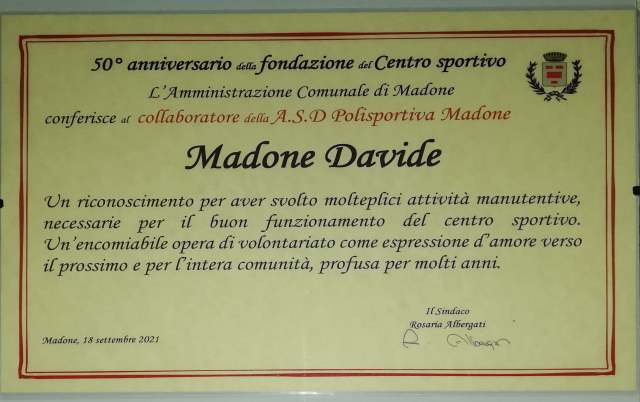 Targa di riconoscimento a Davide Madone ritirata dal nipote Paolo Lego nel 2021, per il 50° anniversario di fondazione del Centro Sportivo.