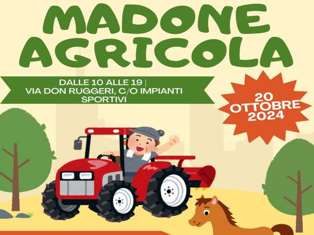 Il Comune di Madone, con la partecipazione della Coldiretti Bergamo, ha organizzato per domenica 20 ottobre, dalle ore 10 alle ore 19, presso gli impianti sportivi, un evento dal titolo "MADONE AGRICOLA". All'interno della manifestazione troverete un'area food, l'esposizione "C'era una volta Madone", laboratori, sport e un'area pony. In ogni caso, per conoscere tutti i dettagli dell'evento, vi invitiamo a visionare la locandina presente all'interno del link sottostante.