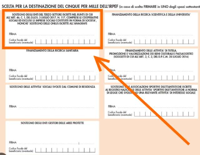 Per donare il 5x1000 all'Associazione "MADONE 2.0 ODV", nella specifica sezione del Modello 730, firmate all'interno del riquadro "Sostegno degli Enti del Terzo Settore iscritti nel RUNTS di cui all'Art. 46 C. 1 del D.Lgs. 3 luglio 2017, n. 117, comprese le Cooperative Sociali ed escluse le Imprese Sociali costituite in forma di società, nonché sostegno delle ONLUS iscritte all'anagrafe" e inserite il Codice Fiscale 91055400161, come mostrato nelle immagini sottostanti: