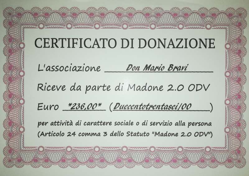Come ogni anno a questa parte, dopo l'approvazione del Bilancio d'Esercizio di Madone 2.0 ODV e in ottemperanza delle disposizioni statutarie, il Presidente Natale Sangalli ha consegnato la cifra corrispondente al quinto delle entrate complessive, all'associazione (o associazioni) scelte durante l'Assemblea dei Soci svoltasi nel primo quadrimestre del 2025. A conti chiusi l'importo da devolvere è risultato pari a 236 euro e considerata la somma esigua, prima di procedere a votazione, i Soci hanno deciso che sarebbe stata destinata interamente all'ente più scelto al termine della stessa, senza procedere ad ulteriori divisioni. L'esito della votazione, avvenuta fra le associazioni di Madone che ne avevano diritto, ha prodotto i seguenti risultati: