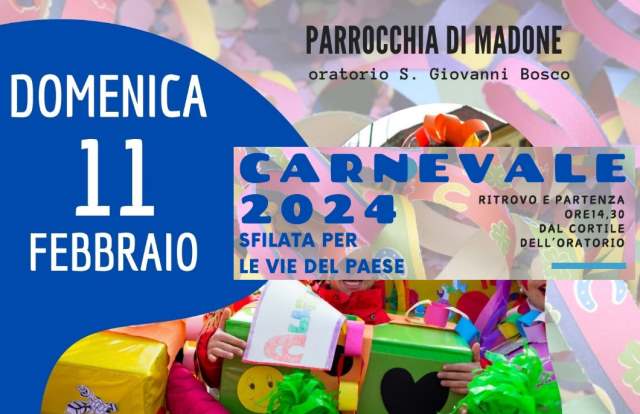 Domenica 11 febbraio, ci sarà la sfilata di Carnevale per le vie del paese. Ritrovo e partenza alle ore 14:30 dal cortile dell'Oratorio, dove troverete frittelle, chiacchiere, animazione e tanto divertimento. Non Mancate!