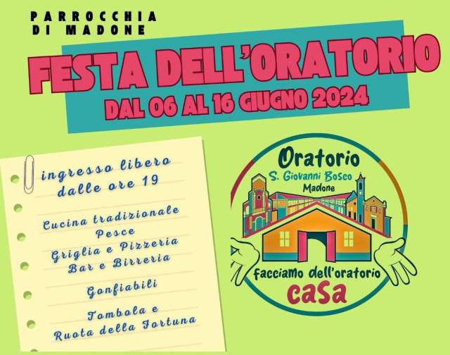 La Parrocchia di Madone, anche quest'anno, ha organizzato la Festa dell'Oratorio, in programma dal 6 al 16 giugno. L'ingresso sarà libero a partire dalle ore 19, con cucina tradizionale, pesce, griglia, pizzeria, bar e birreria. Ci saranno i gonfiabili per i più piccoli, tombola, ruota della fortuna, musica e tanto divertimento! Vi aspettiamo! (Il ricavato della festa andrà a coprire il debito dell'Oratorio).